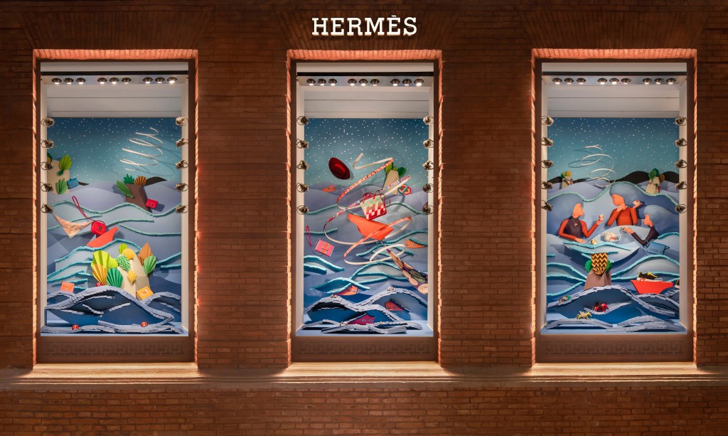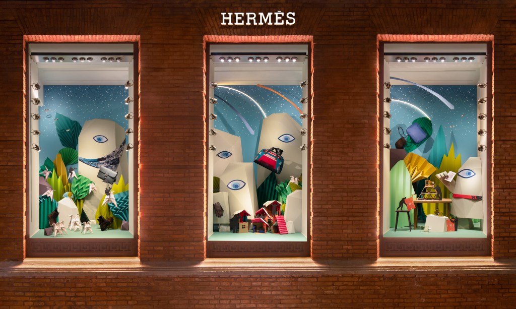 The autumn window display at the Hermès Maison in Shanghai is a theatrical stage in the downtown area.